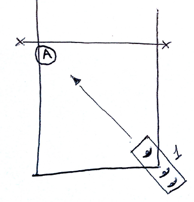 • Compagno in posizione A (anche se la figura non e’ proprio precisa…): il compagno che ha palleggiato la palla precedente, si mette in posizione A, lontano mezzo braccio dalla rete e 1 metro fuori dalla linea laterale (non cosi’ dentro il campo come nella figura). Il compagno alza le mani e fa da punto di riferimento per l’arrivo della palla, segnalando al compagno se il palleggio / bagher è andato a buon fine o se è errato (corto, lungo, staccato, attaccato, basso, ….)