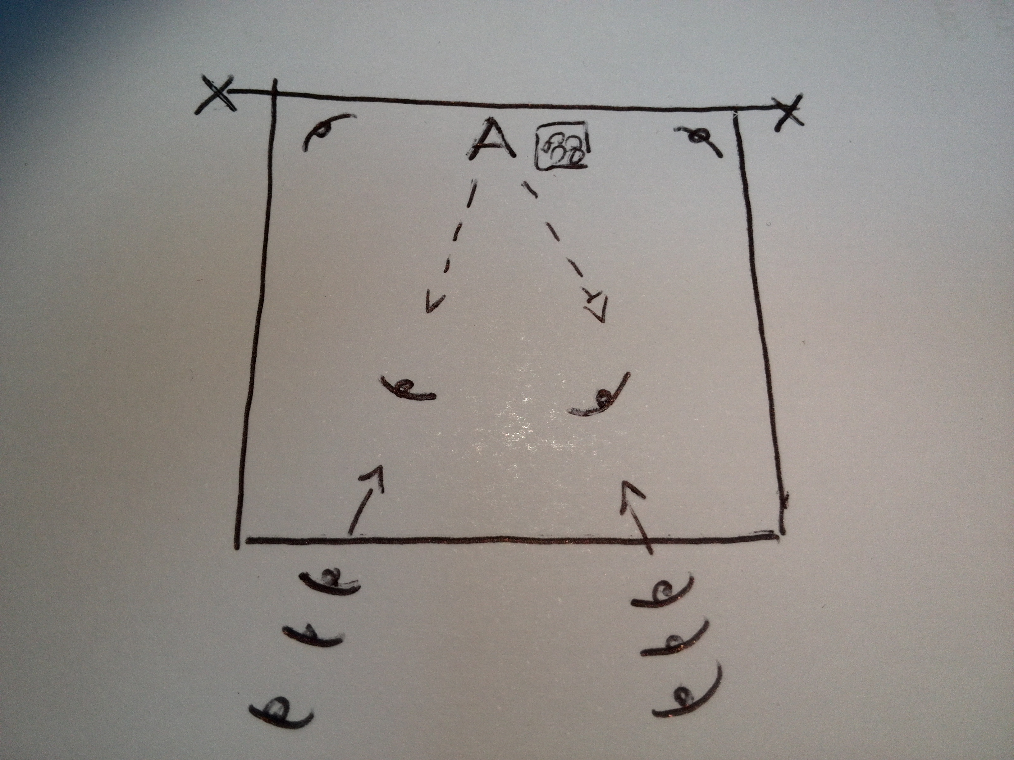 Semplice esercizio con attacchi da P2, P3 e P4. Attacchi da una sola parte del campo. La dififcoltà è solo per l’allenatore, che deve organizzare il tutto affinchè non si ingarbuglino gli attacchi: